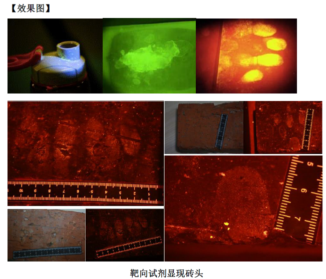 配合DNA靶向試劑和生物熒光顯現劑可快速顯現疑難客體的生物痕跡。試劑成份安全,不破壞DNA結構。